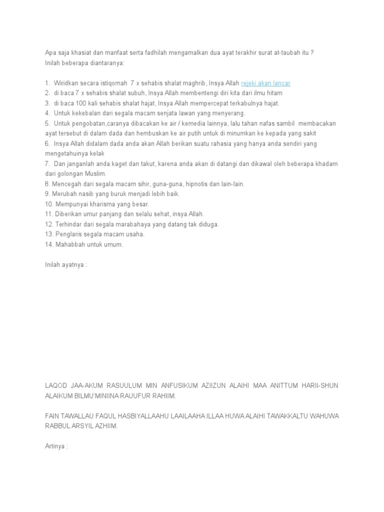 Hanya mereka yang mengamalkan bacaan surah ini sahaja yang tahu tentang 'khasiat' dua potong ayat ini. Laqod ja'akum rosuulum min anfusikum 'aziizun 'alaihi. Home posts tagged 'keutamaan dzikir surat at taubah dua ayat terakhir' keutamaan dzikir surat at taubah dua ayat terakhir. Keutamaan dua ayat terakhir surat al baqoroh bbg al ilmu. Keutamaan dua ayat terakhir surat al baqoroh bbg al ilmu. Mistik sesungguhnya amalan wirid 2 ayat terakhir surat at taubah beserta khasiatnya kekuatan doa kata kata indah ayat. Sesungguhnya telah datang kepada kalian seorang rasul dari kaum kalian sendiri, berat terasa olehnya penderitaan kalian, sangat menginginkan (keamanan dan keselamatan) bagi kalian, amat belas kasihan lagi penyayang terhadap. Setelah membaca sholawat, bacalah doa di bawah ini. Segala puji dan anugerah hanyalah milik allah. Dengan kesitimewaan dua ayat surat at taubah itu, muslim perlu mengamalkannya tiap selepas shalat fardu terutama setelah shalat magrib dan subuh. Tak terkecuali dua ayat terakhir dalam surat at taubah. Bacalah 2 ayat terakhir surat al baqarah di malam hari darwoto s webblog. Oleh karena itu, jika anda ingin kuat, ingin.